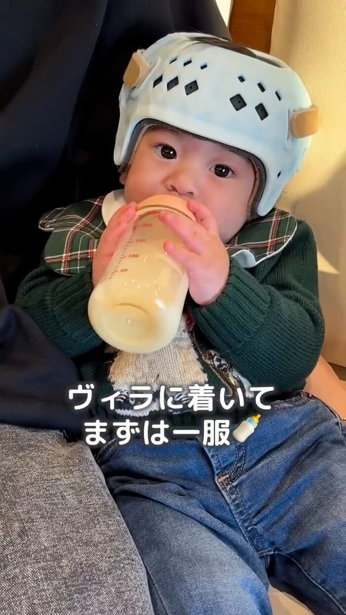 そしてヴィラに到着すると、まずは双子ちゃんたちのミルクタイムのようです。「ヴィラに着いて まずは一服」という文字と共に、哺乳瓶を両手でしっかり持ちながら一生懸命ミルクを飲む愛らしい姿が紹介されました。大きな瞳でこちらを見つめる“ぴーくん”表情に、思わず心が和みます。