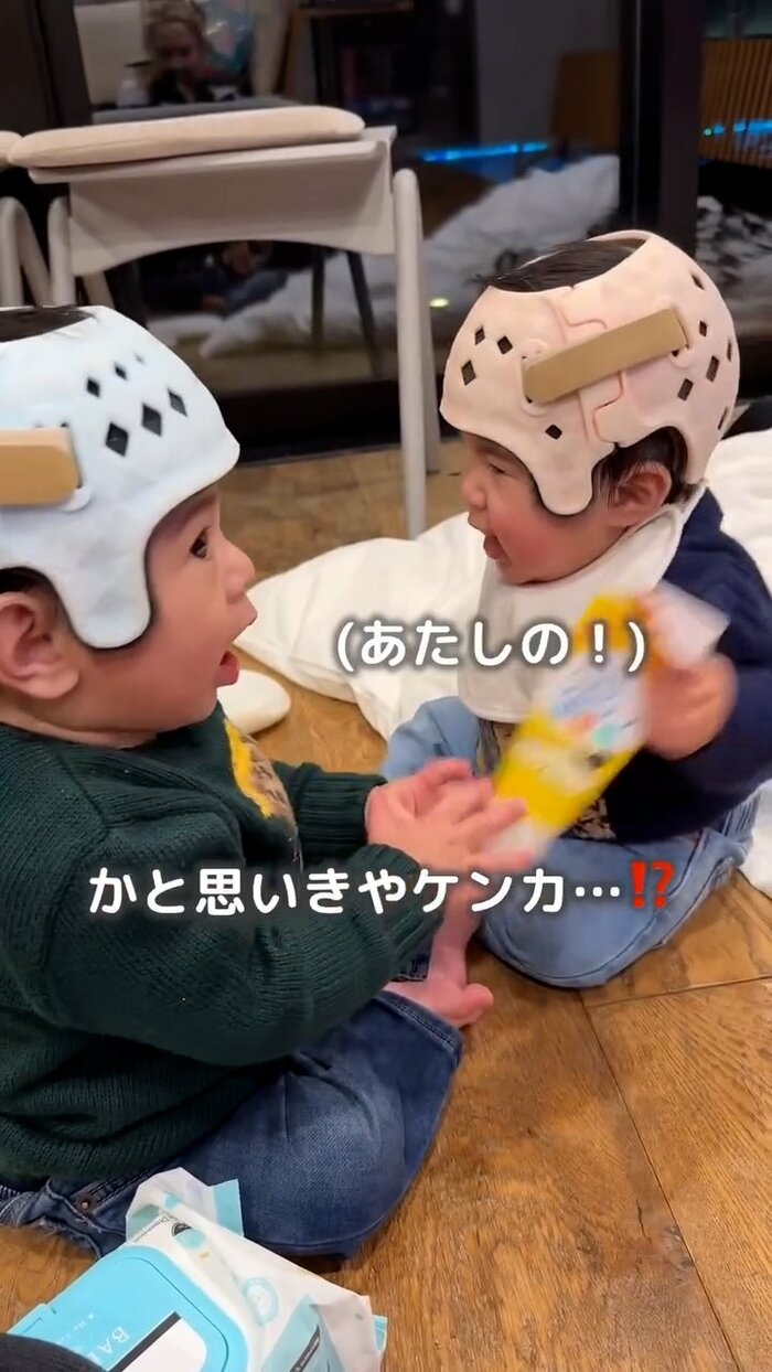かと思えば、黄色いチューブのパックをめぐって「(あたしの!)」と主張する“りーちゃん”と、驚いたような表情でそれを見つめる“ぴーくん”の姿も。二人の可愛すぎる兄妹ゲンカに思わず笑みがこぼれます。