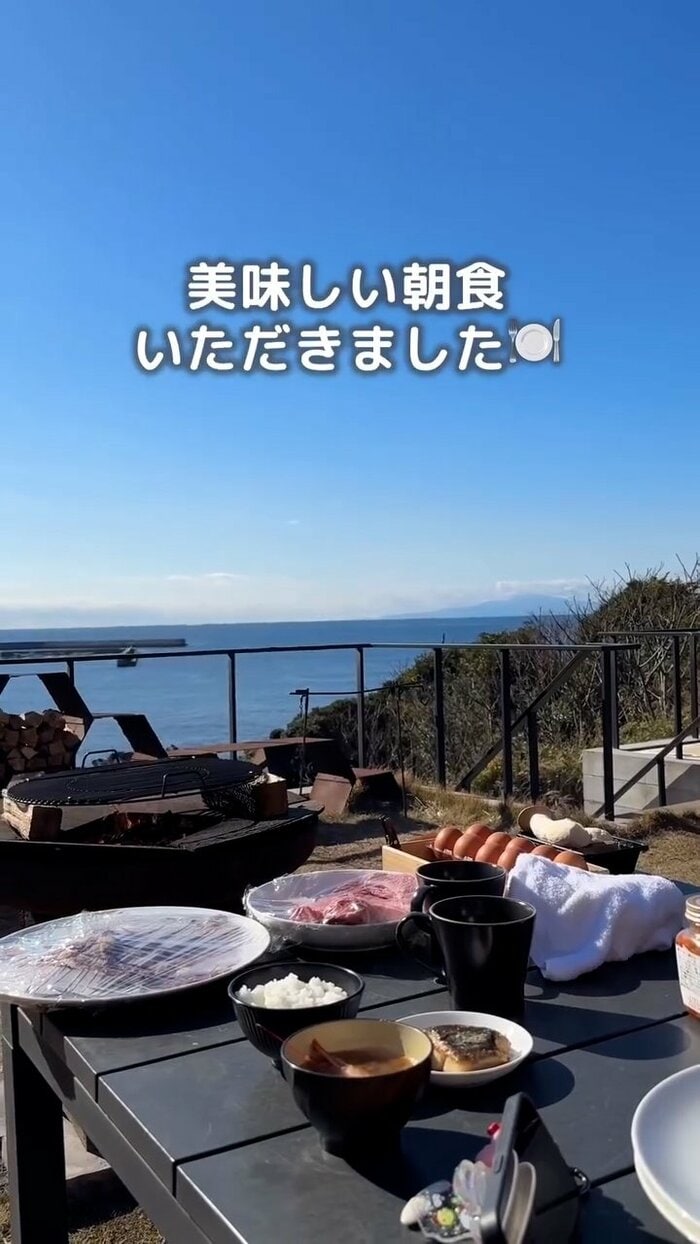 翌朝には「美味しい朝食 いただきました」とつづり、海を臨むテラスでの朝食の様子もアップ。テーブルにはお肉や卵、ご飯などが並び、青い海と空を眺めながら、贅沢な朝のひとときを過ごしたようです。