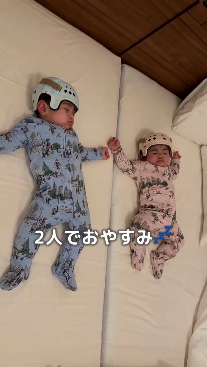 そして夜には、「2人でおやすみ」と、ベッドの上で眠る双子の姿が。青とピンクの色違いのつなぎを着て、ヘルメットをかぶったまま、両腕を広げてすやすやと眠る寝顔は、まさに天使のようです。