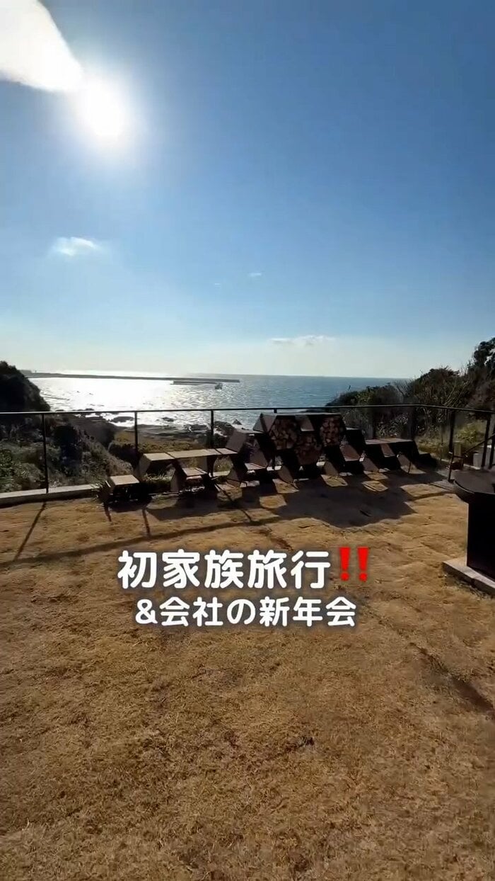 動画の最初では「初家族旅行!! &会社の新年会」という文字が添えられており、宿泊した部屋に備え付けのテラスから見えるオーシャンビューを披露!これからの楽しい旅の始まりを予感させます。