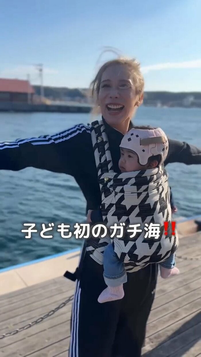 また、「子ども初のガチ海!!」と、海のそばに来るのは初めてだったという子供達。穏やかな海を背景に、ありしゃんさんは抱っこ紐で“りーちゃん”を抱きながら、喜びを体いっぱいに表現するように両腕を大きく広げています。