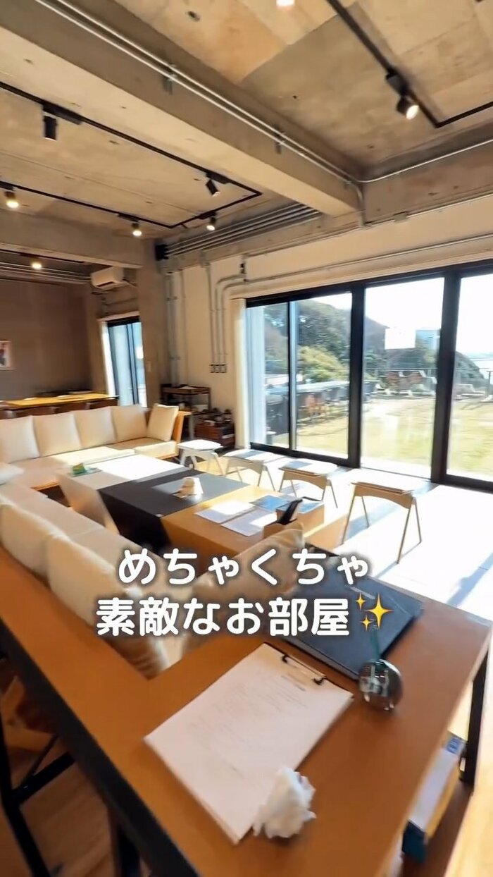 そして部屋の中へカメラを映すとコンクリートの天井と大きな窓が印象的な、開放感あふれるモダンなリビングがあり、「めちゃくちゃ 素敵なお部屋」とありしゃんさんも感激の様子です。