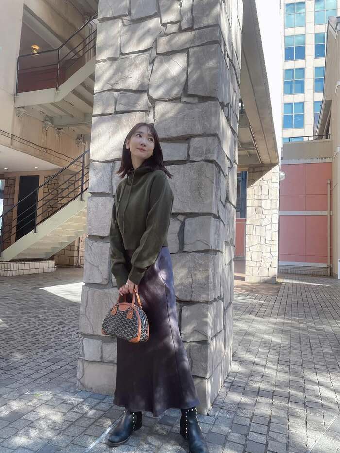 カーキのパーカーに、ブラウンのマーメイドスカート、足元にはブラックのショートブーツを合わせた姿。そして、両手で持ったバックもブラックをチョイスしています。色を絞ったシックなコーデで、大人っぽさが漂っていますね。