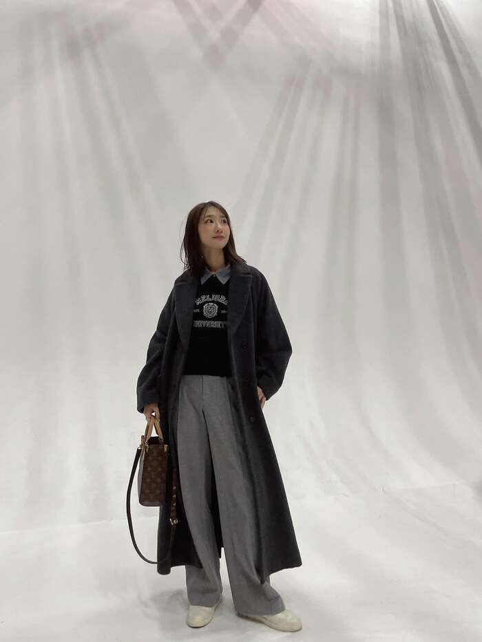 襟付きのインナーに黒いトレーナーを重ね着し、下にはグレーのセミワイドパンツを合わせています。足元は白いスニーカー、そして上から黒いロングコートを羽織った、上品かつ軽やかなスタイルです。