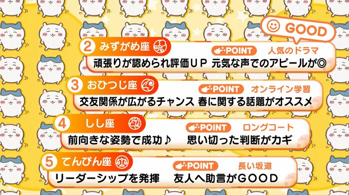 『めざましテレビ』で放送中の「ちいかわ占い」 テレビ放送がない日はお休みで、月~土:朝7時以降に更新予定です。