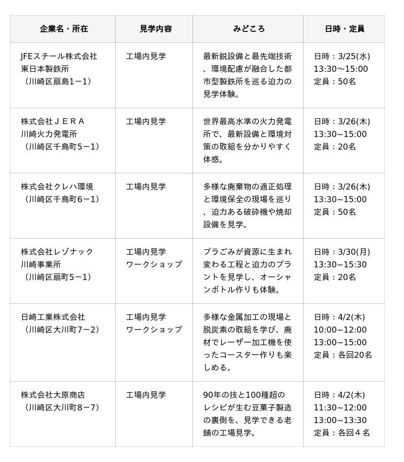 3月25日(水)~4月2日(木)川崎臨海部に所在する6社の工場見学や体験ワークショップを実施いたします。