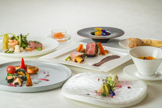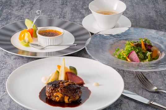 前菜、魚料理、肉料理、デザートなどシェフのこだわりを堪能できる贅沢なコース。