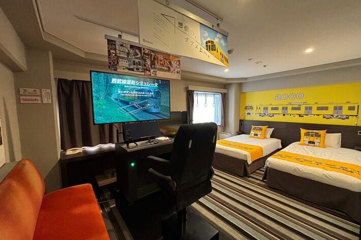 お部屋全体を西武鉄道2000系のイエローカラーでコーディネート。壁面や装飾に至るまで統一感のあるデザインとし、足を踏み入れた瞬間から鉄道の世界観に浸れる空間を演出しています。