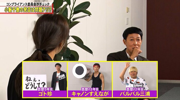 「コンプライアンス委員会」では、ヒコロヒーさんから「(ブラッシュアップ会議に参加した)3人は、実は若手芸人で、前回(の収録後)、小籔さんにネタを披露していた」ことが明かされましたが、本人はまったく覚えていなかった様子。