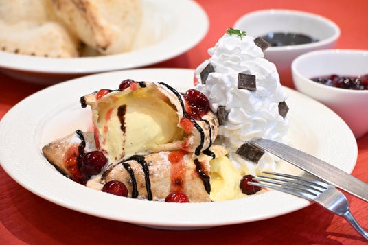 パイのように膨らんだ熱々の生地で、大ぶりのバニラアイスを包み込みました。仕上げにお客さま自身でチョコとベリーのソースをたっぷりとかけて楽しむ”体験型スイーツ”です。
