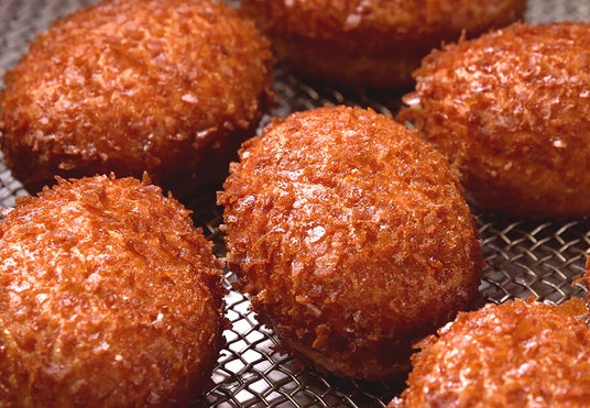 豚と牛の合挽きを玉ねぎソテーと生クリームでくつくつ煮込んだカレーには、とろとろのバナナピューレを惜しみなく投入。まろやかなコク、甘い香り、漂うフレッシュ感、全てがとろけあった絶妙の旨とろカレーです。繊細なフィアンティーヌで仕立てた衣は、サクサク響く格別の香ばしさ。パンは、もっちりふんわり。洋菓子屋だからこその旨みがあふれだします。