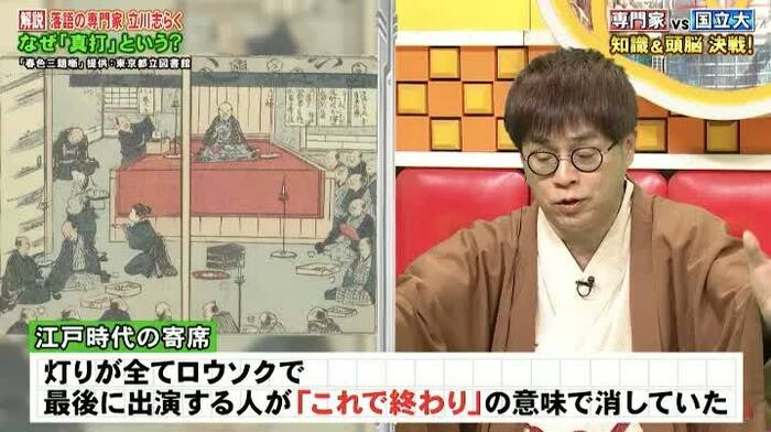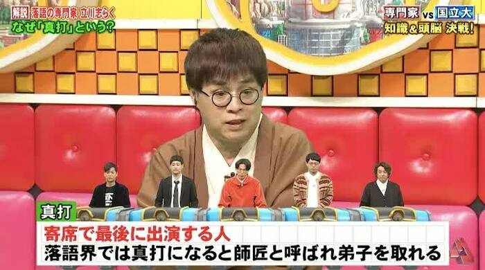 立川志らくさんが伝授してくれたのは、問題に出題された落語の「真打」という言葉の由来。真打とは「前座」「二つ目」に続いて落語で最も高い位で、興行の“トリ”を務めることができる人のことです。