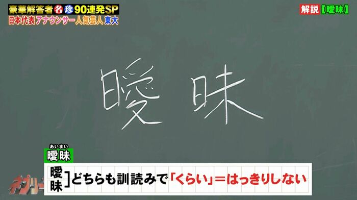 「曖昧」の「曖」と「昧」は、どちらも「日へん」と覚えるのが基本。訓読みをするとどちらも「くらい」と読むので、「はっきりしない」という意味で使われます。