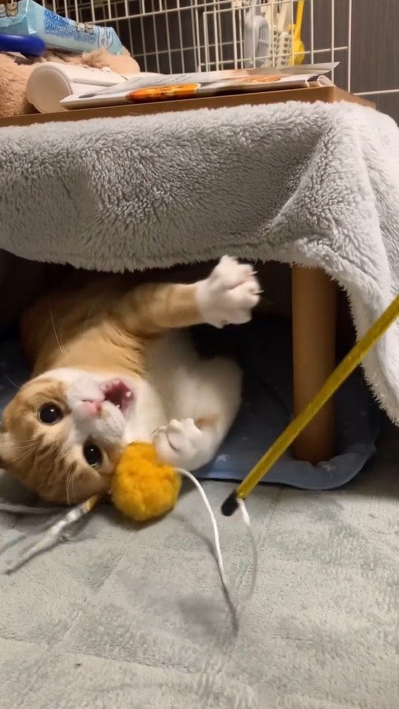 机の下に入ったまま、寝転んで飼い主さんと遊んだりと、どれも愛くるしいです。