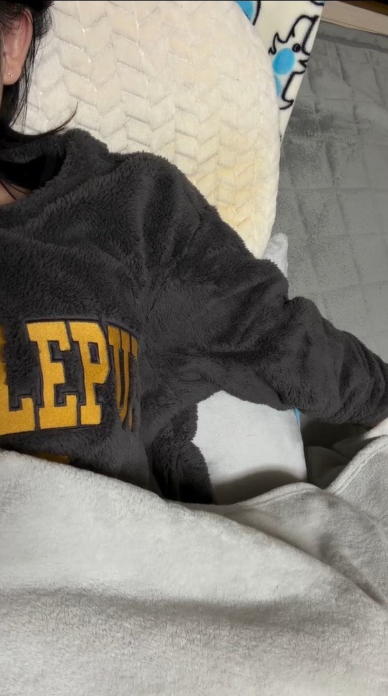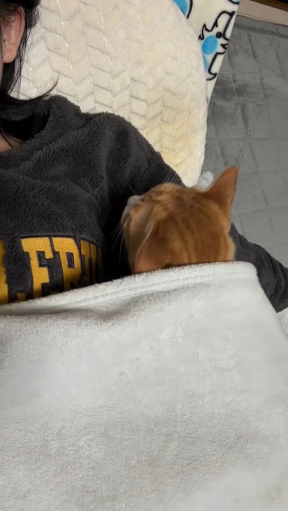 投稿された動画には、毛布をかけベッドに横になる飼い主さんの姿が映っています。