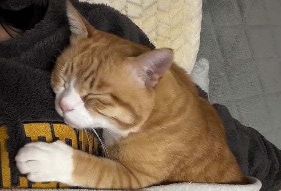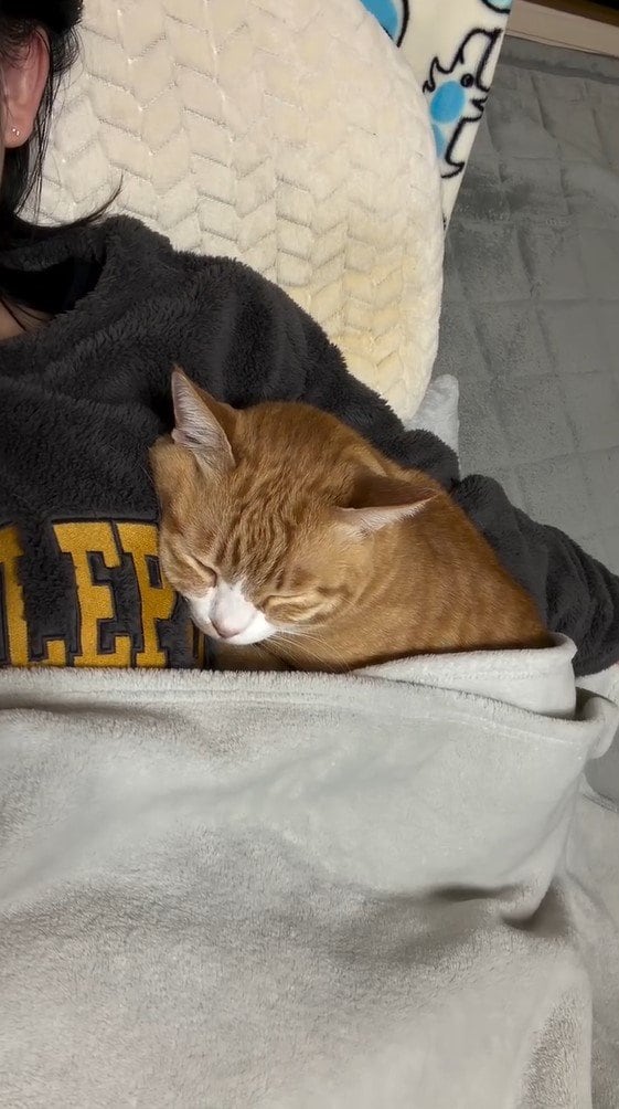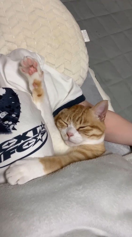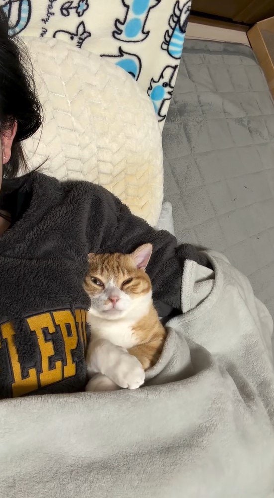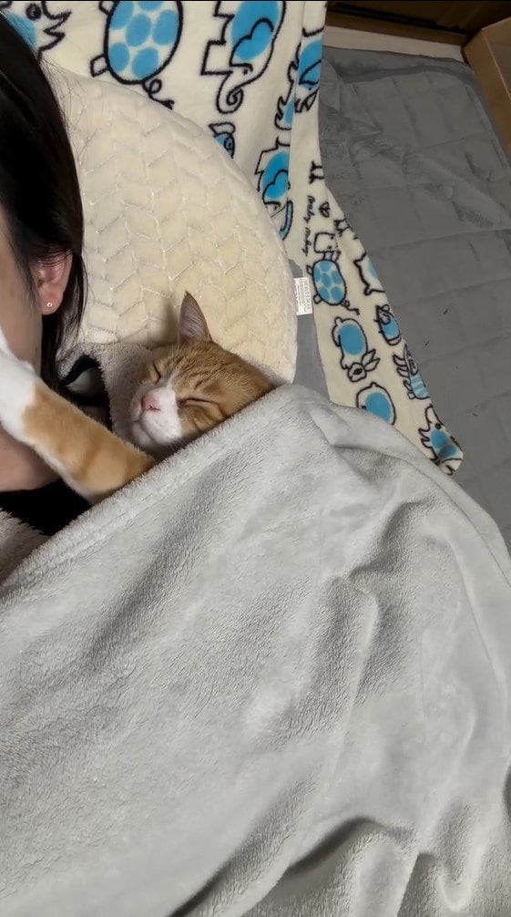 今回反響を呼んだのは「添い寝が上手な猫というよりは、もはやほぼ人間」とつづり、投稿されたとらまるくんのほっこり姿です。
