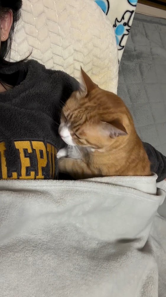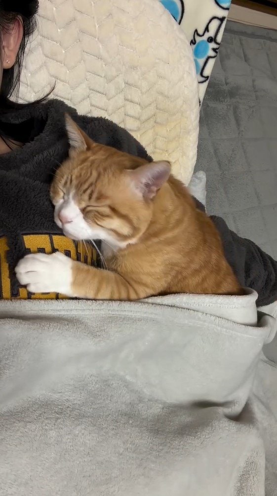 他の投稿でも、毛布が掛かったまま、飼い主さんの脇にあおむけで寝転ぶとらまるくんの姿が!