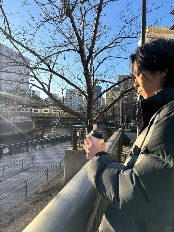 高層ビルが立ち並ぶ川沿いの道では、柵に手をかけてほっと一息。オフ感あふれる姿が、ファンにはたまりません。