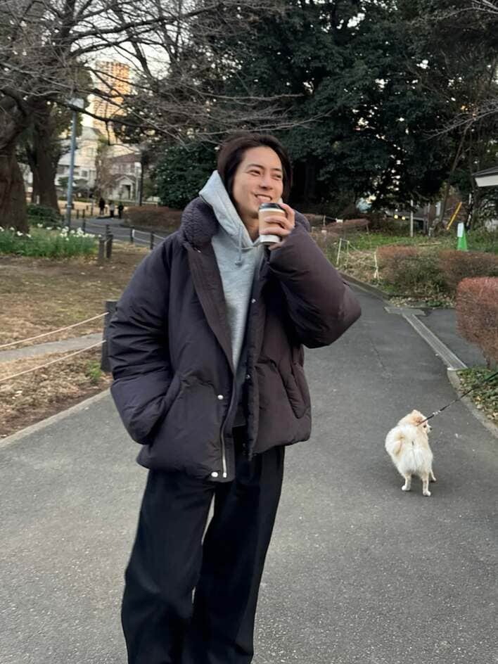 まずは、グレーのパーカーに黒のダウンを羽織り、カップの飲み物を片手に遊歩道を歩いているショット。山下さんはメガネやマスクなどの変装アイテムは持たずに、飾らない自然な姿でにっこりと笑顔を見せています。