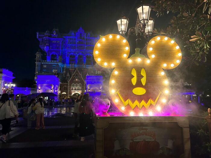 また、タワー・オブ・テラーの前のミッキー型のオブジェは夜になるとライトアップ!あたりには霧が立ち込め、妖しげな雰囲気に変わります。