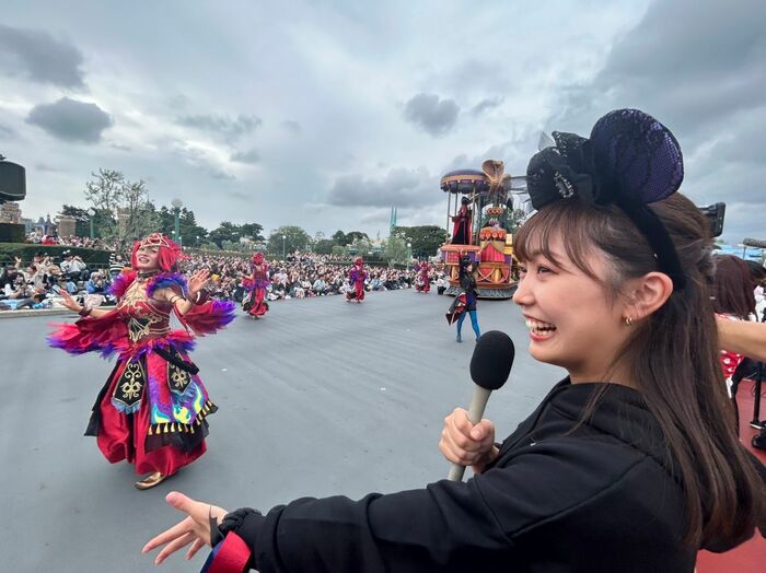 パークの中に入って高崎アナが体験したのは、お昼のパレード『ザ・ヴィランズ・ハロウィーン“Into the Frenzy”』。