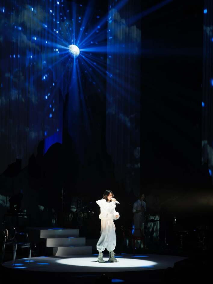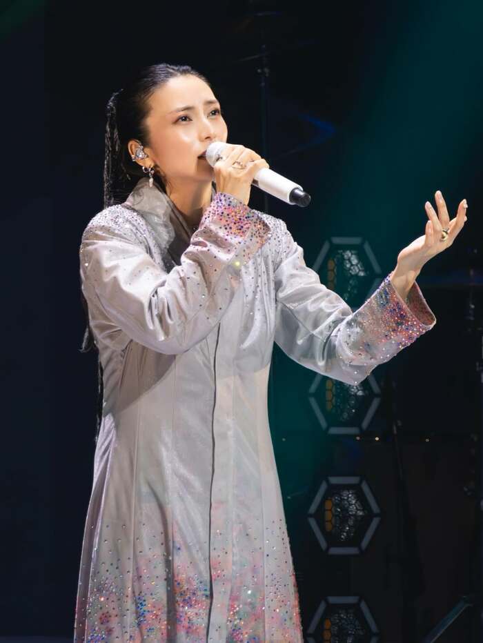 まずは、黒のロングヘアをオールバックで1本にまとめ、袖や裾にカラフルなストーンを多数ちりばめたグレーの衣装を身にまとったショット。柴咲さんは片手にマイクを握り、もう一方の手をそっと前に差しだし、斜め前を向きながら歌っています。
