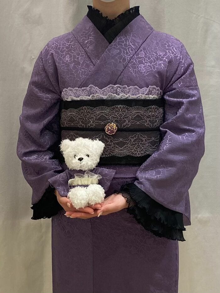 このぬいぐるみと同じ着物は、全て生地から選んで仕立てたオリジナル着物で、色無地13色レース7色の中から選ぶことができます