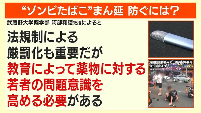 阿部教授は、“ゾンビたばこ”のまん延を防ぐには、「法規制による厳罰化も重要だが、教育によって薬物に対する若者の問題意識を高める必要がある」と話します。