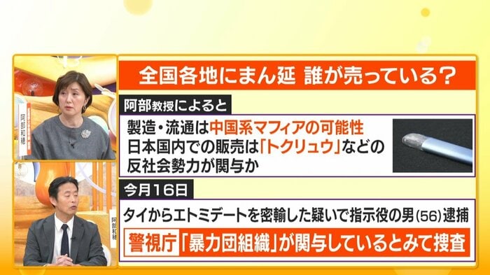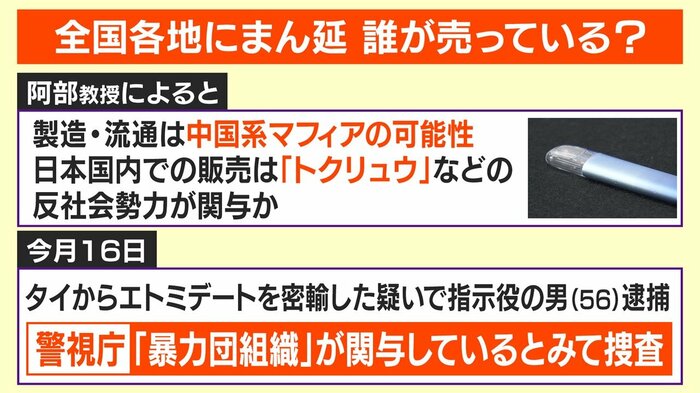 製造・流通はおそらく中国マフィアが関与していると言われています。また、日本国内での販売に関しては、いわゆる“トクリュウ”と呼ばれる反社会的勢力が関与していると。事実、そういう関係の人物が逮捕されているという報道もありますので、その可能性が高いと思っています。