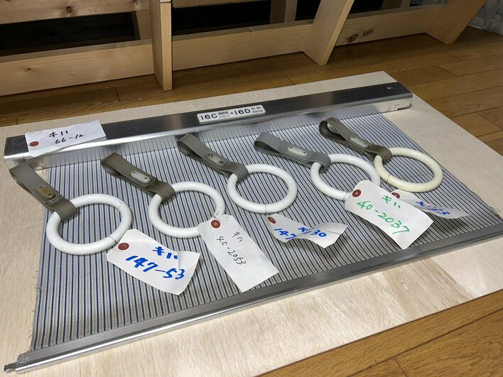 JR九州の鉄道部品である、つり革が5つ並んだショットや・・・