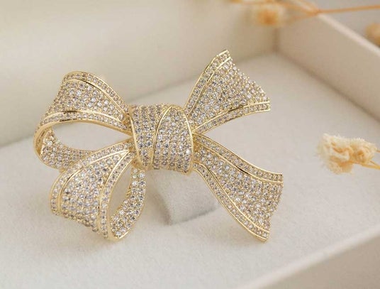 洗練されたデザインとリュクス感あふれるクリアクリスタルを繊細にあしらったゴールドのリボンブローチ。