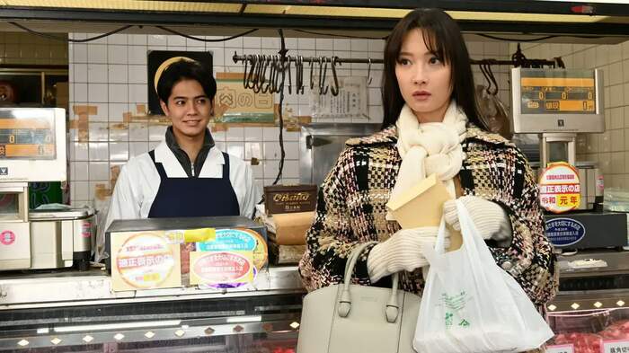 仕事帰りに、蛍(菜々緒)は自転車に乗って「山田精肉店」へ。店主(片寄)が「いらっしゃい!」と出てきます。