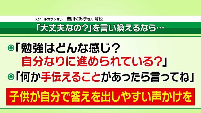 普川先生が「大丈夫なの?」の言い換え表現として挙げたのは、「勉強はどんな感じ?」「自分なりに進められている?」「なにか手伝えることがあったら言ってね」というセリフ。ポイントは、子どもが自分で考えて答えを出せる問いかけであることなのだとか。