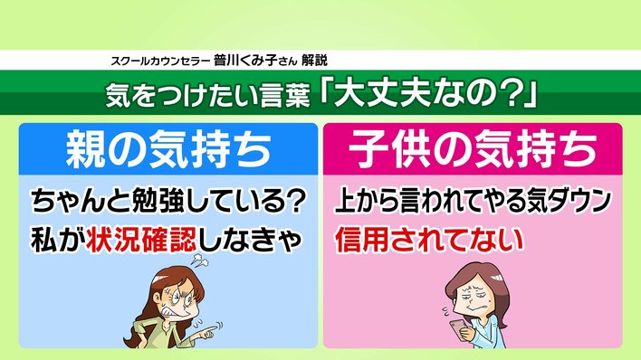 普川さんによると、受験シーズンに一番気をつけたいのは「大丈夫なの?」という一言。親は子どもの状況を確認したい一心で言ってしまいがちですが、子どもは「自分は信用されていないのでは?」と感じてしまうといいます。