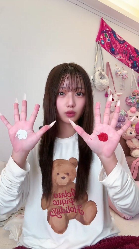 両手の手の平に赤と白の塗料を塗った希空さん。
