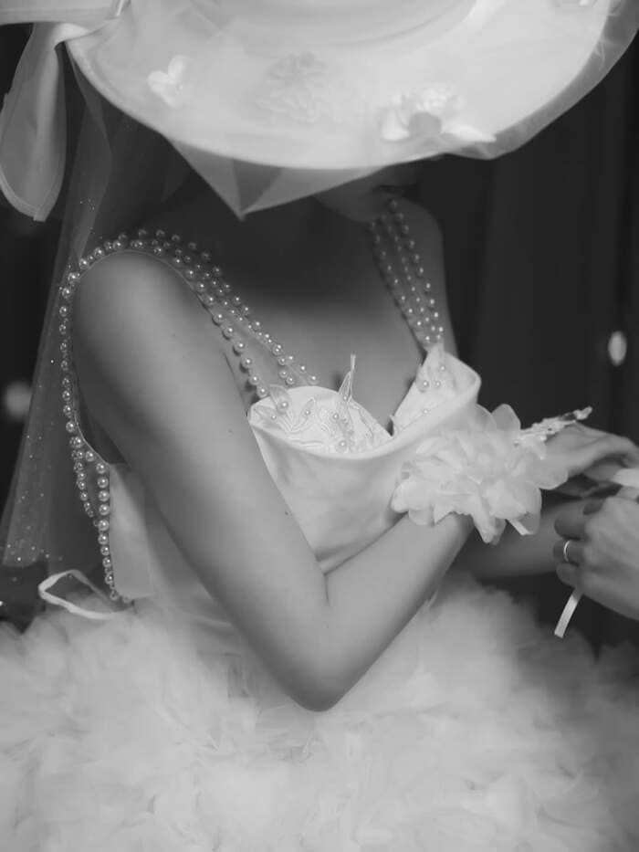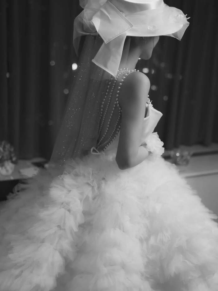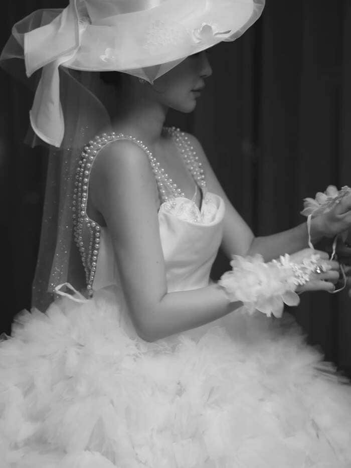 公開されたモノクロ写真には、肩ひも部分にパールがあしらわれたクラシカルな純白のドレスに身を包んだ休井さんの姿が。胸元には草花モチーフのデザインが施され、スカートはキュッと束ねたチュールがいくつも合わさったようなデザインになっています。