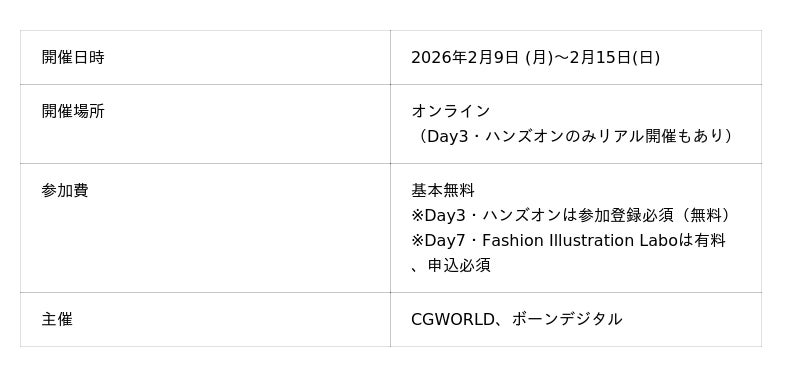 株式会社ボーンデジタル(本社:東京都千代田区、CEO:新 和也、URL:https://www.borndigital.co.jp/)は、2026年2月9日(月)から15日(日)まで、「CGWORLD Fashion Week」を開催します。