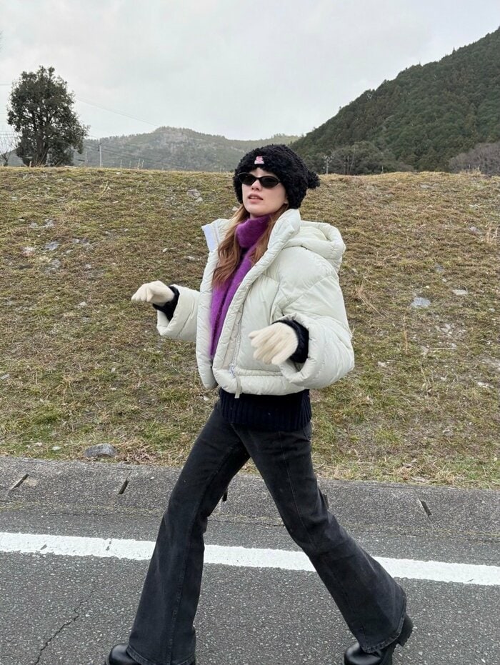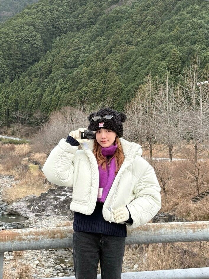 そこには、白いダウンに紫のマフラーを巻き、黒いもこもこの帽子をかぶり、顔の横で小さなカメラを持ったRIOさんの姿が。後ろにはのどかな自然が広がっていて、RIOさんはリラックスしたような表情を浮かべています。