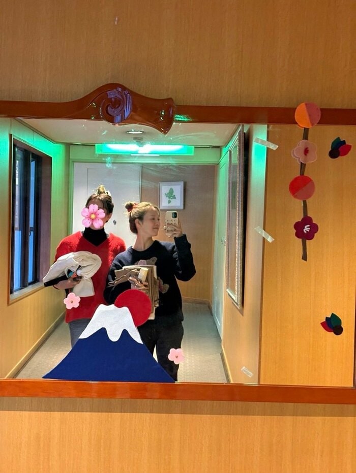 そして最後には、鏡越しの自撮りショットを公開!髪をお団子にまとめたRIOさんの隣には、RIOさんと同じくお団子ヘアをした女性が1人並んでいます。背丈はRIOさんより少し高く、顔はスタンプで隠されていて分かりませんが、柔らかな雰囲気がRIOさんにそっくりです。