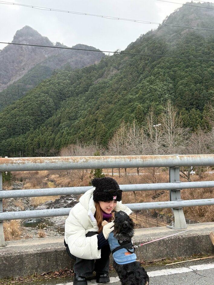 しゃがんで愛犬と戯れているショットでは、お互いに顔を近づけて見つめ合っているようで、見ているだけで心がほっこり♪