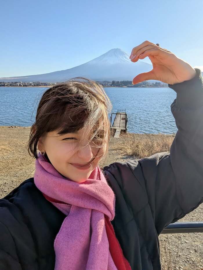 次は、そんな富士山に、片手で作った自身のハートのポーズを合わせたおちゃめカットも。