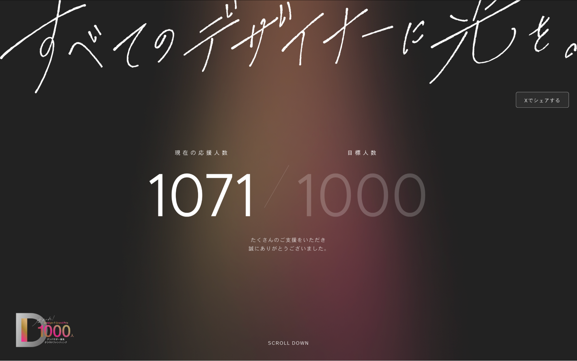 たくさんの方のご支援やSNSでのシェアに助けられ、合計1071人にご支援いただくことができました。無事Design-1グランプリが開催できたのは、応援いただいたみなさまのおかげです。心よりお礼申し上げます。