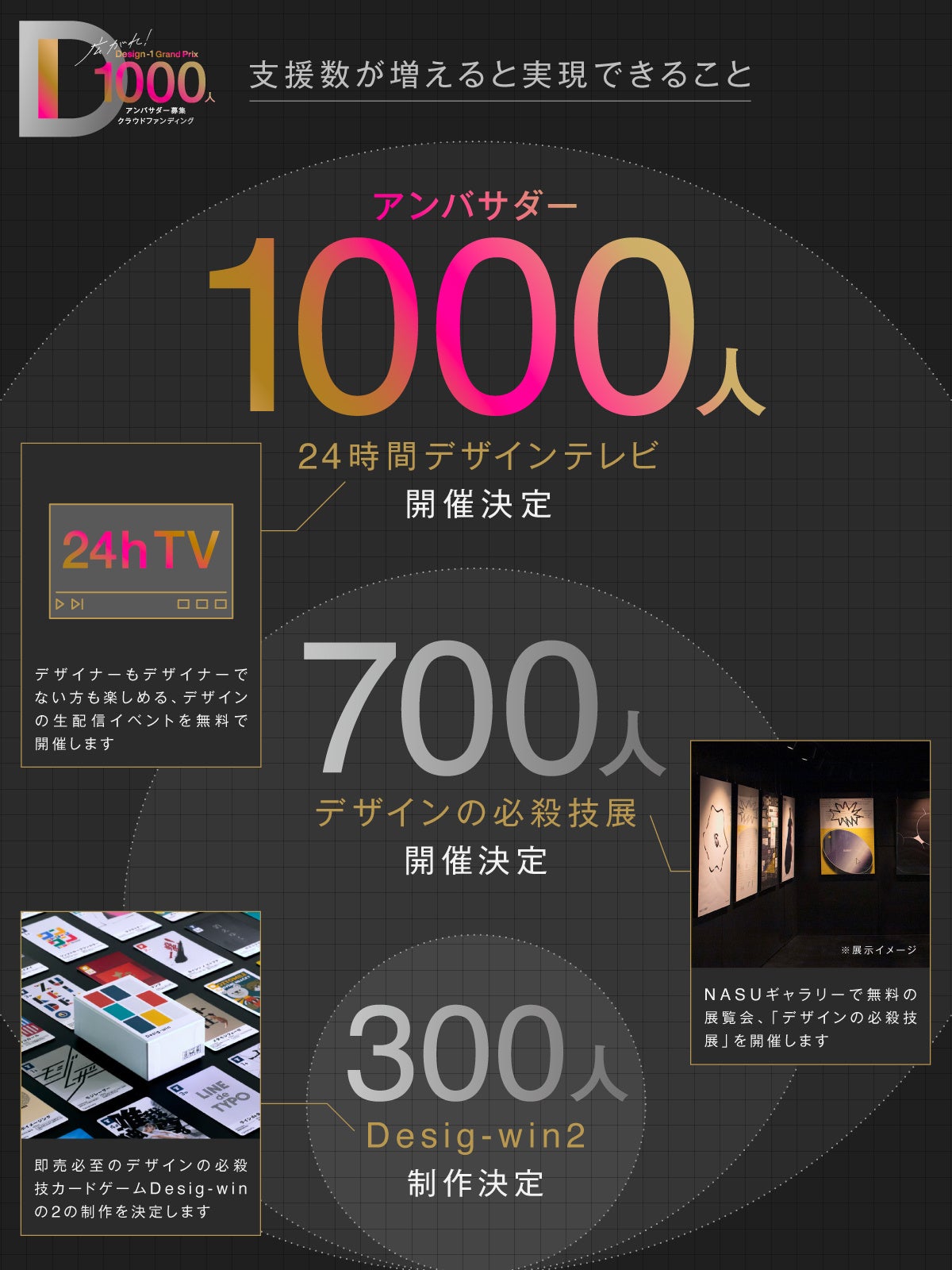 Design-1グランプリをより多くの人に広げるために、金額ではなく「1000人」の壁を超えることを目標とした、1人1口までのクラウドファンディングです。