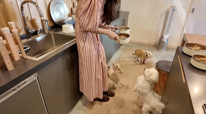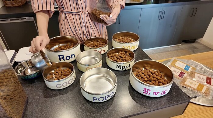 今回は、自宅で飼っている9匹の愛犬たちに大人気だというドッグフードを紹介。広々としたキッチンで、愛犬たちの食事を準備する様子を披露しました。