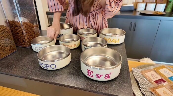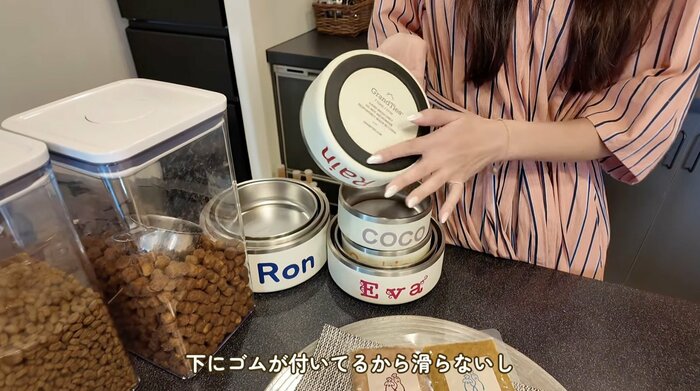 このフードボウルも新調したそうで、白地にそれぞれの名前がプリントされた可愛らしいデザイン。軽量なステンレス製で、底には滑り止めのゴムが付いており、「だいぶ気に入っております」と森さんも太鼓判を押していました。