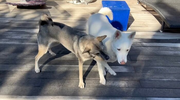 暖かな日差しが降り注ぐ庭で、愛犬たちはそれぞれ元気いっぱいに遊び回ります。