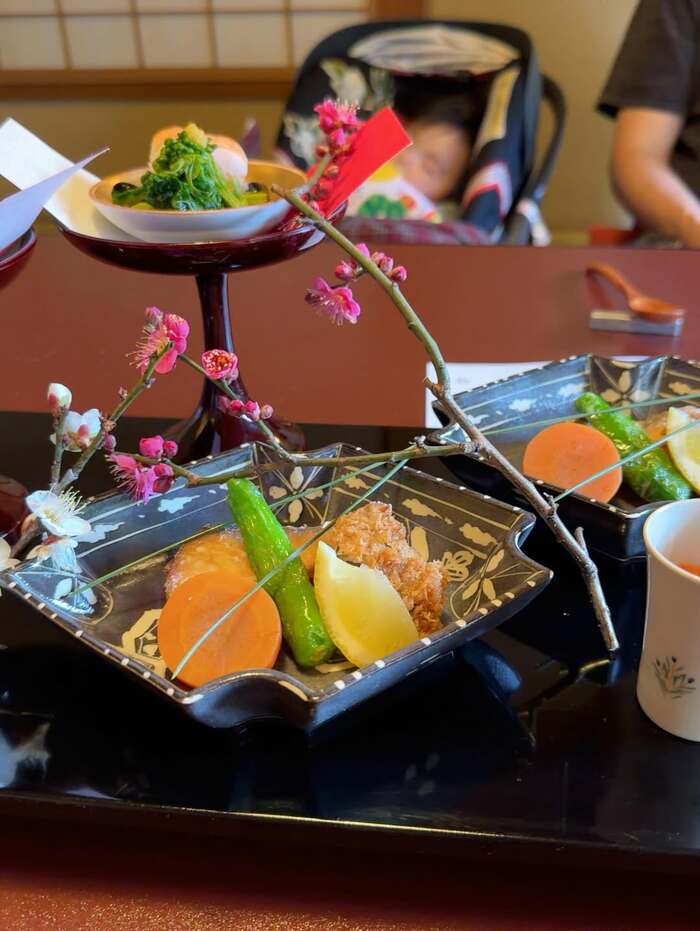 梅の花が添えられた華やかな会席料理は、ししとうやニンジンがのった魚料理や、