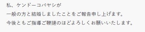 掲載された文章には「私、ケンドーコバヤシが一般の方と結婚しましたことをご報告申し上げます。」とまずは結婚を報告。「今後ともご指導ご鞭撻のほどよろしくお願いいたします。」と、丁寧につづります。