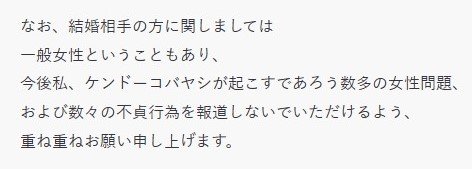 結婚したお相手が一般女性だったということで「今後私、ケンドーコバヤシが起こすであろう数多の女性問題、および数々の不貞行為を報道しないでいただけるよう、重ね重ねお願い申し上げます。」と、予防線を張っています。